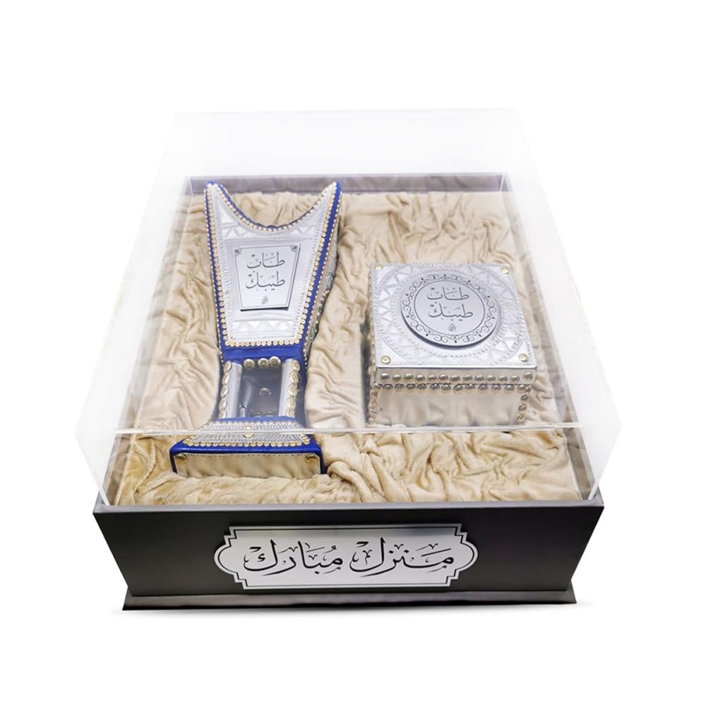 - علبة بخور مقاس 14 سم × 14 سم ملكي حفر ليزر فضي للإهداء بالاسم يوجد بداخلها :