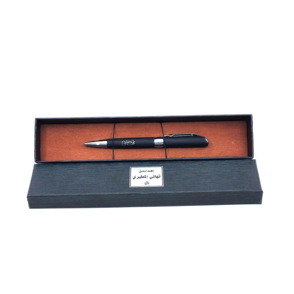قلم أسود مع كتابة الاسم عليه باللون الذهبي قص وحفر ليزر.